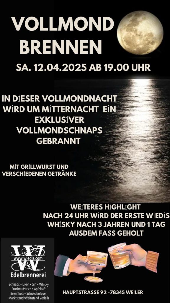 Magische Nacht, heiße Tropfen!Erlebe eine besondere Nacht, wenn Feuer auf Mondschein trifft! Komm zu unserem Vollmondbrennen und genieße edle Tropfen in stimmungsvoller Atmosphare.Was dich erwartet:• Traditionelles Brennen unter dem Vollmond• Verkostung feinster Brände & LiköreEin besonderes Highlight!Nach drei Jahren ist es endlich so weit: Beim diesjährigen Vollmondbrennen wird der erste WiedisWhisky aus dem Fass geholt!Sei…